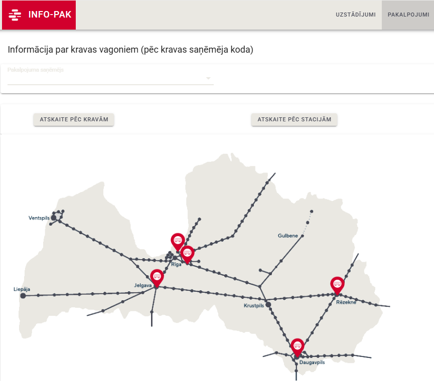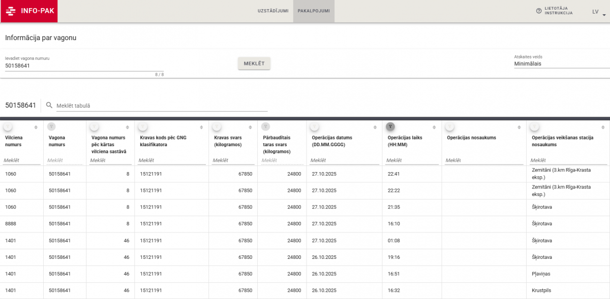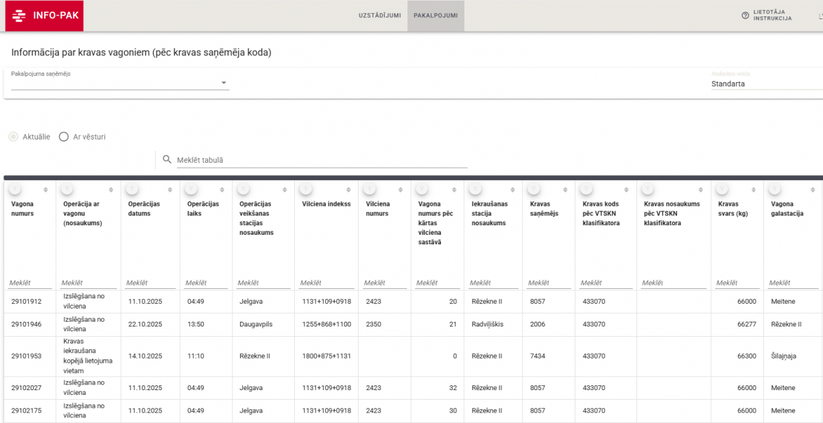 - Informāciju par kravas vagoniem (pēc vagonu numuriem)