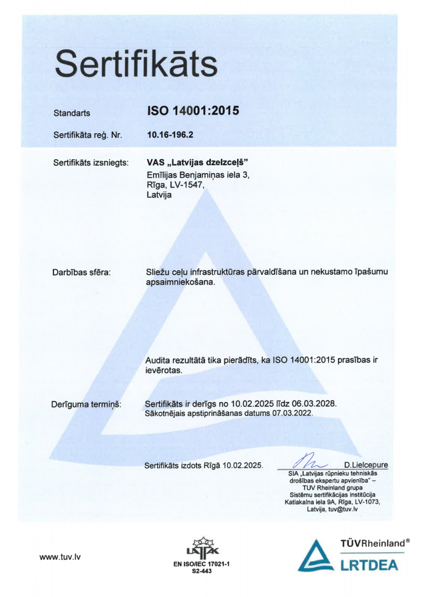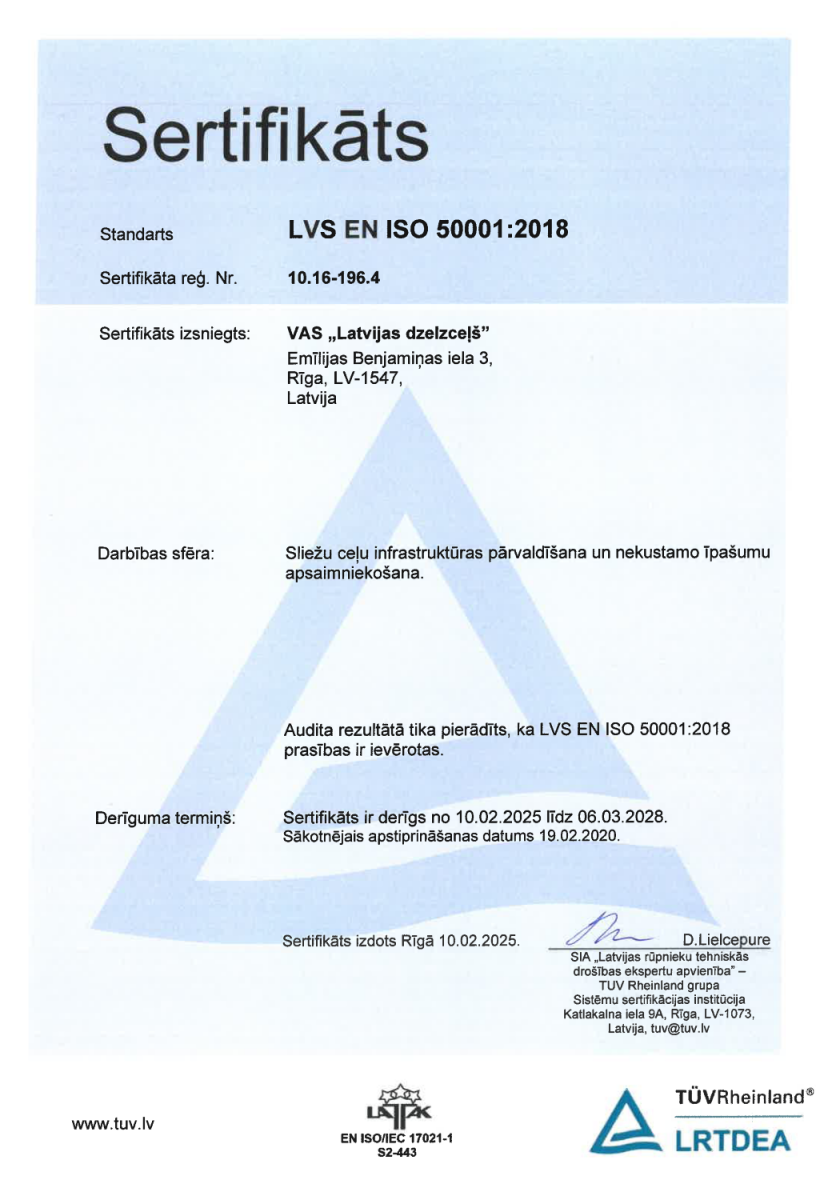 VAS “Latvijas dzelzceļš” sertificēta un integrēti uzturēta vides un energopārvaldības sistēma atbilstoši standartu ISO 50 001:2018 un ISO 14 001:2015 prasībām.