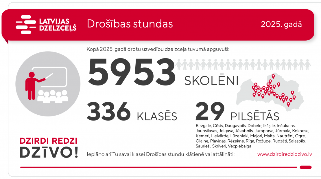 Visa informācija par drošību dzelzceļa sliežu tuvumā, Drošības stundām, kā arī citas aktualitātes ir atrodamas speciāli izveidotā LDz mājaslapā www.dzirdiredzidzivo.lv.