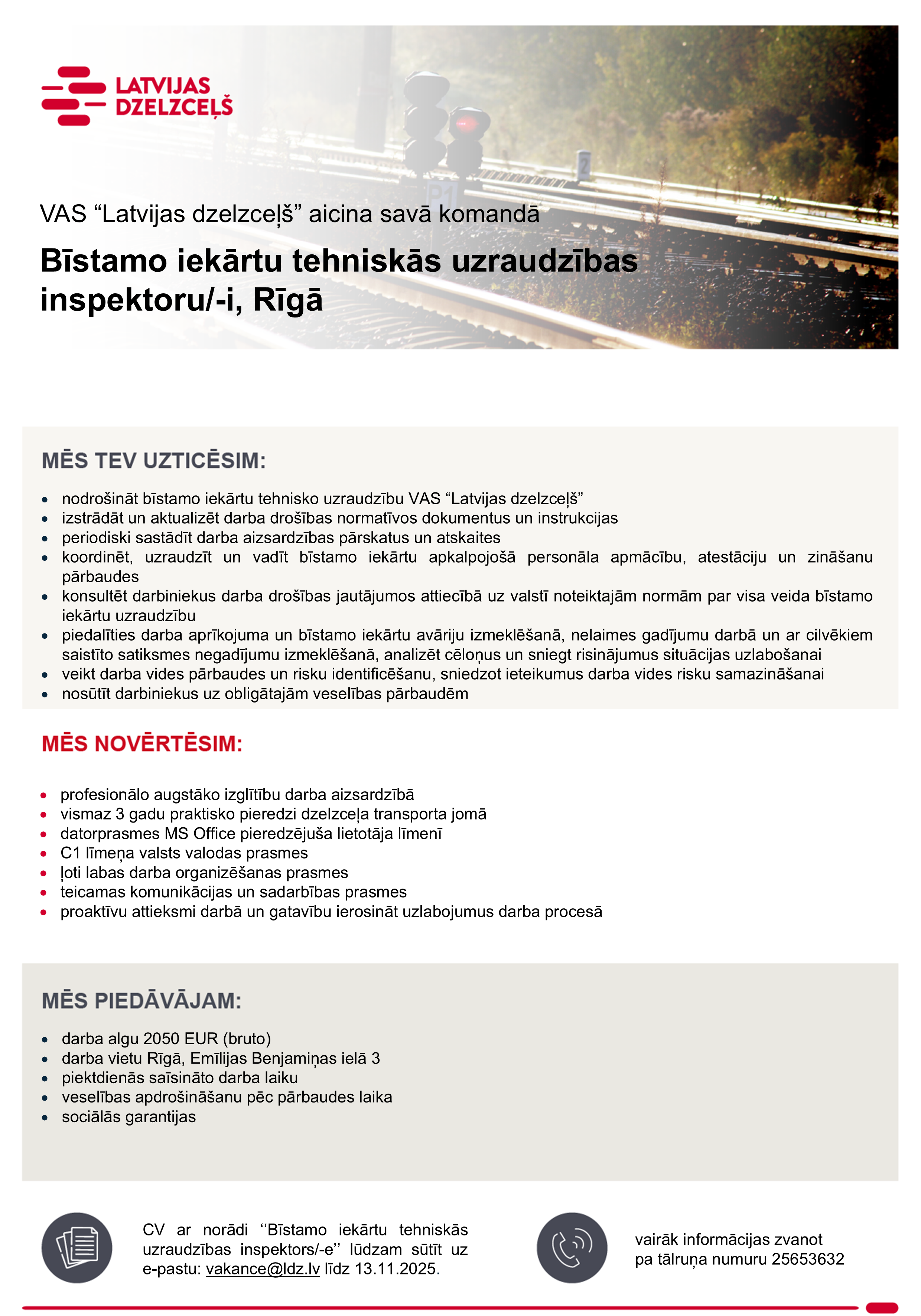 Piesakoties amata vakancei pretendents apliecina, ka sniegtie dati ir patiesi un piekrīt, ka Koncerns “Latvijas dzelzceļš” veiks šo datu apstrādi darbā iekārtošanās nolūkā. Mēs iesniegtos datus uzglabāsim VAS “Latvijas dzelzceļš” datu bāzē 1 gadu pēc konkursa beigām ar mērķi nodrošināt savu tiesību aizsardzību. Iesūtot datus, pretendents var izteikt piekrišanu savu datu uzglabāšanai Koncerna “Latvijas dzelzceļš” datu bāzē 1 gadu, lai tos izmantotu arī citos Koncerna “Latvijas dzelzceļš”  sabiedrībās piemērotu vakanču personāla atlases procesos. Pēc pretendenta pieprasījuma, personas dati var tikt dzēsti jebkurā brīdī, informāciju sūtot e-pastu – datuaizsardziba@ldz.lv. Vairāk informācijas par personu datu apstrādi: Privātuma politika.