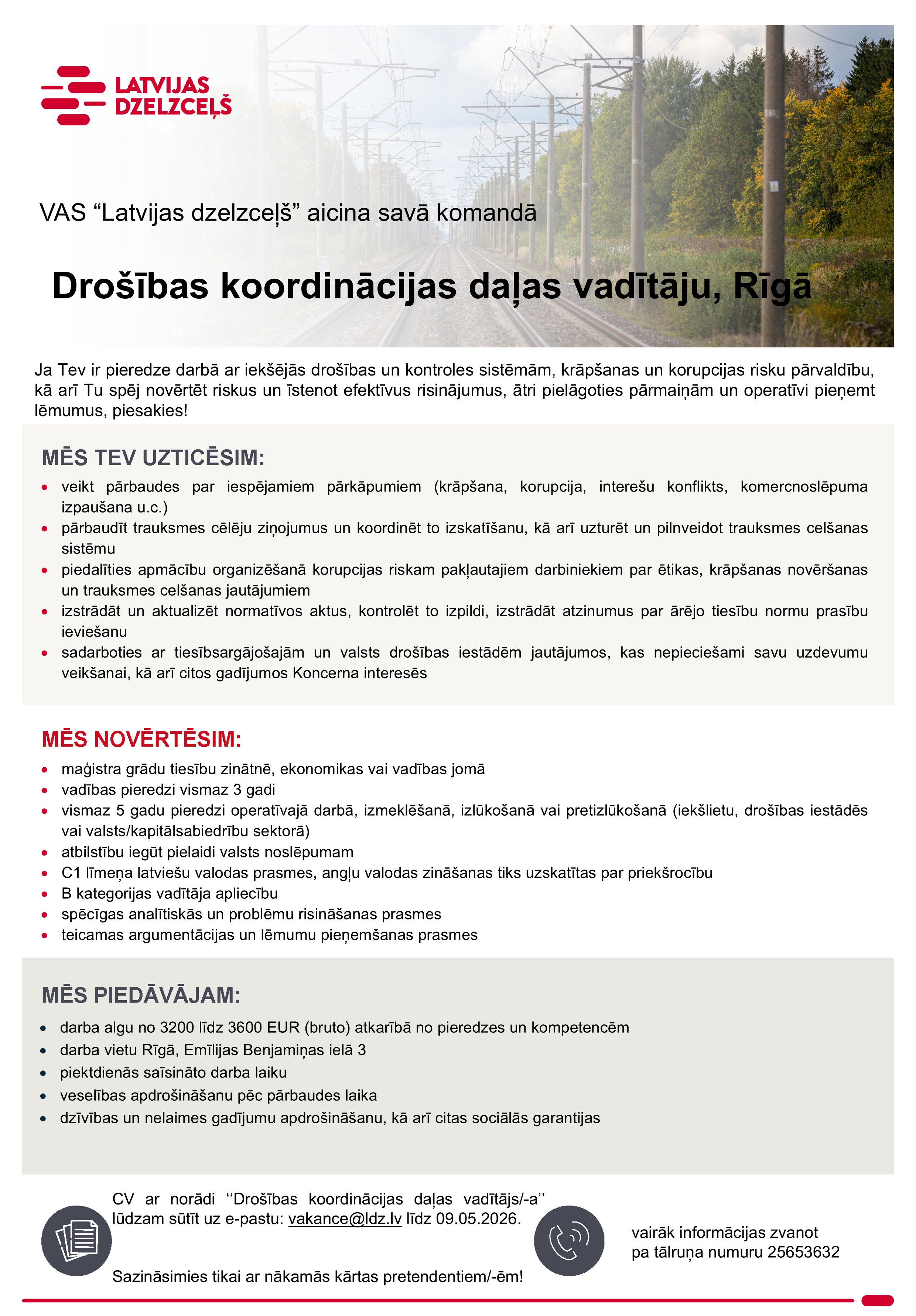 Piesakoties amata vakancei pretendents apliecina, ka sniegtie dati ir patiesi un piekrīt, ka Koncerns “Latvijas dzelzceļš” veiks šo datu apstrādi darbā iekārtošanās nolūkā. Mēs iesniegtos datus uzglabāsim VAS “Latvijas dzelzceļš” datu bāzē 1 gadu pēc konkursa beigām ar mērķi nodrošināt savu tiesību aizsardzību. Iesūtot datus, pretendents var izteikt piekrišanu savu datu uzglabāšanai Koncerna “Latvijas dzelzceļš” datu bāzē 1 gadu, lai tos izmantotu arī citos Koncerna “Latvijas dzelzceļš”  sabiedrībās piemērotu vakanču personāla atlases procesos. Pēc pretendenta pieprasījuma, personas dati var tikt dzēsti jebkurā brīdī, informāciju sūtot e-pastu – datuaizsardziba@ldz.lv. Vairāk informācijas par personu datu apstrādi: Privātuma politika.