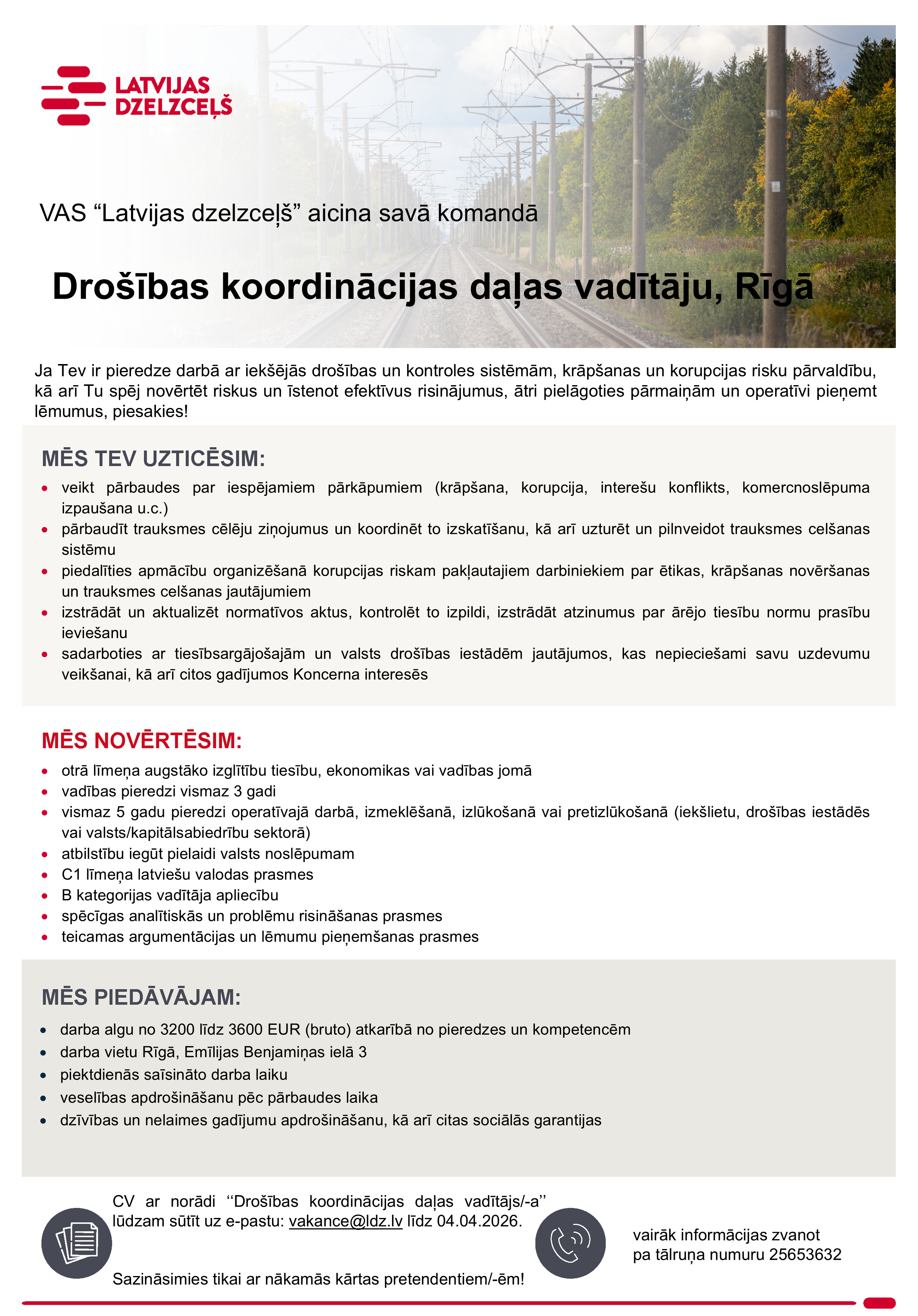 Piesakoties amata vakancei pretendents apliecina, ka sniegtie dati ir patiesi un piekrīt, ka Koncerns “Latvijas dzelzceļš” veiks šo datu apstrādi darbā iekārtošanās nolūkā. Mēs iesniegtos datus uzglabāsim VAS “Latvijas dzelzceļš” datu bāzē 1 gadu pēc konkursa beigām ar mērķi nodrošināt savu tiesību aizsardzību. Iesūtot datus, pretendents var izteikt piekrišanu savu datu uzglabāšanai Koncerna “Latvijas dzelzceļš” datu bāzē 1 gadu, lai tos izmantotu arī citos Koncerna “Latvijas dzelzceļš”  sabiedrībās piemērotu vakanču personāla atlases procesos. Pēc pretendenta pieprasījuma, personas dati var tikt dzēsti jebkurā brīdī, informāciju sūtot e-pastu – datuaizsardziba@ldz.lv. Vairāk informācijas par personu datu apstrādi: Privātuma politika.