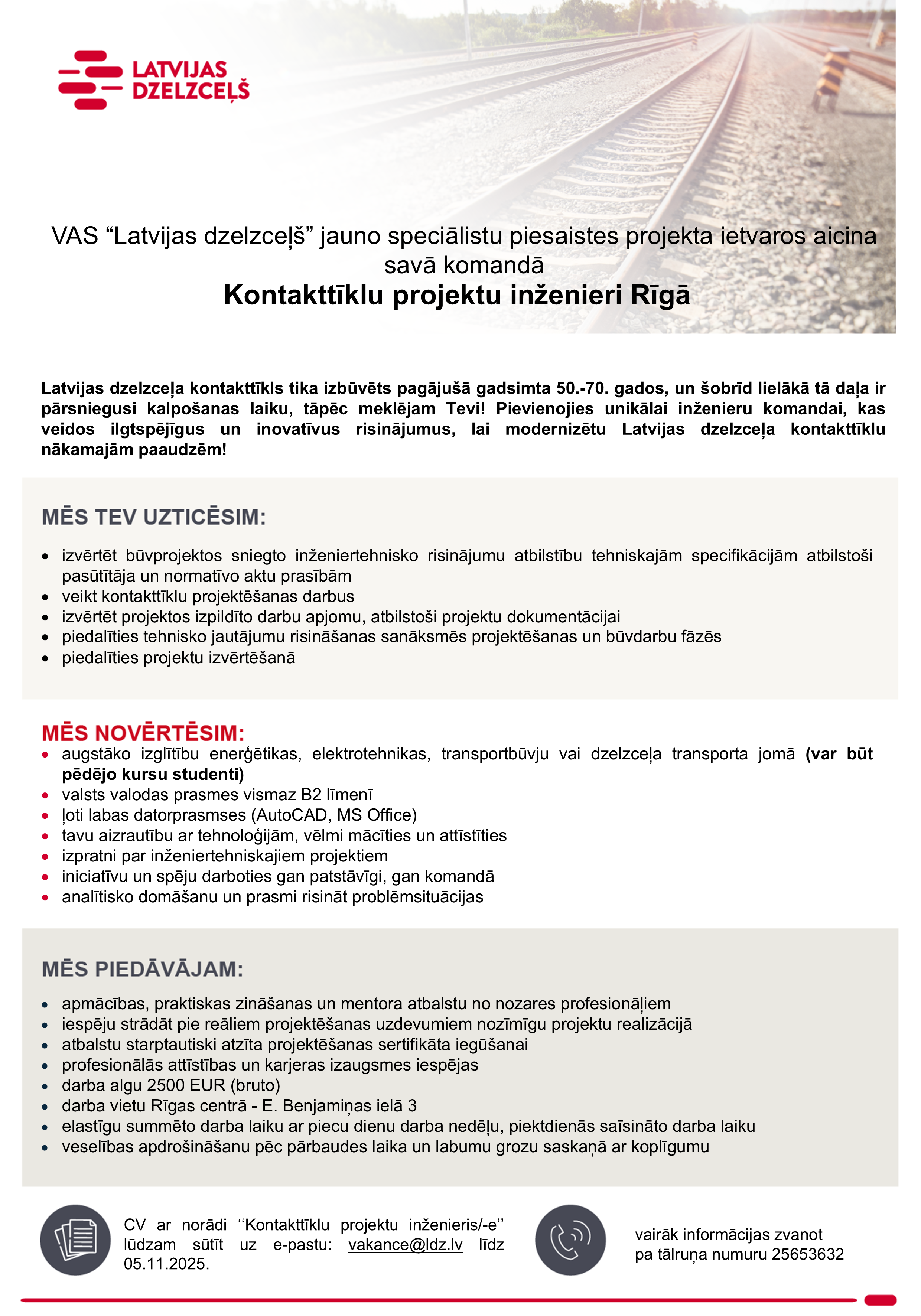 Piesakoties amata vakancei pretendents apliecina, ka sniegtie dati ir patiesi un piekrīt, ka Koncerns “Latvijas dzelzceļš” veiks šo datu apstrādi darbā iekārtošanās nolūkā. Mēs iesniegtos datus uzglabāsim VAS “Latvijas dzelzceļš” datu bāzē 1 gadu pēc konkursa beigām ar mērķi nodrošināt savu tiesību aizsardzību. Iesūtot datus, pretendents var izteikt piekrišanu savu datu uzglabāšanai Koncerna “Latvijas dzelzceļš” datu bāzē 1 gadu, lai tos izmantotu arī citos Koncerna “Latvijas dzelzceļš”  sabiedrībās piemērotu vakanču personāla atlases procesos. Pēc pretendenta pieprasījuma, personas dati var tikt dzēsti jebkurā brīdī, informāciju sūtot e-pastu – datuaizsardziba@ldz.lv. Vairāk informācijas par personu datu apstrādi: Privātuma politika.