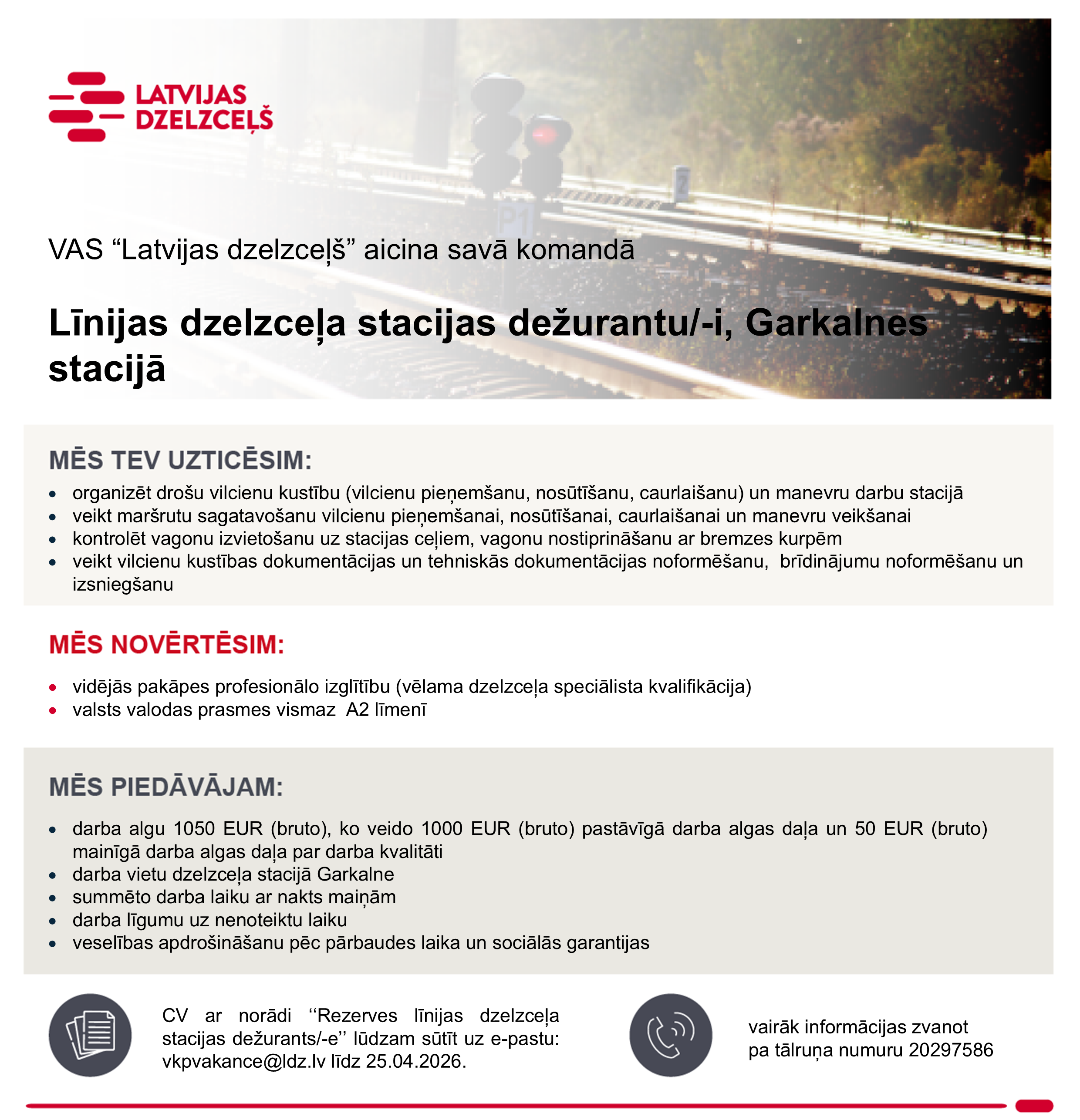 Piesakoties amata vakancei pretendents apliecina, ka sniegtie dati ir patiesi un piekrīt, ka Koncerns “Latvijas dzelzceļš” veiks šo datu apstrādi darbā iekārtošanās nolūkā. Mēs iesniegtos datus uzglabāsim VAS “Latvijas dzelzceļš” datu bāzē 1 gadu pēc konkursa beigām ar mērķi nodrošināt savu tiesību aizsardzību. Iesūtot datus, pretendents var izteikt piekrišanu savu datu uzglabāšanai Koncerna “Latvijas dzelzceļš” datu bāzē 1 gadu, lai tos izmantotu arī citos Koncerna “Latvijas dzelzceļš”  sabiedrībās piemērotu vakanču personāla atlases procesos. Pēc pretendenta pieprasījuma, personas dati var tikt dzēsti jebkurā brīdī, informāciju sūtot e-pastu – datuaizsardziba@ldz.lv. Vairāk informācijas par personu datu apstrādi: Privātuma politika.